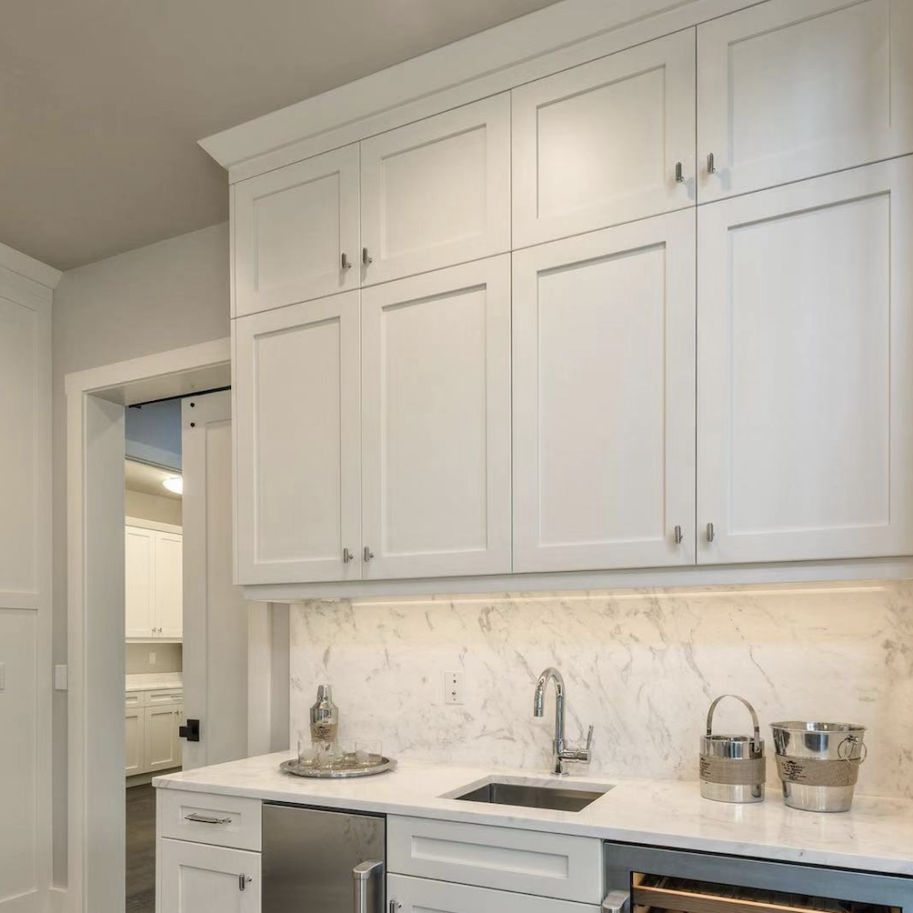White shaker cabinets are in style and often used for modern kitchen designs. Shaker cabinets are sleek yet stylish and very easy to clean. Shaker cabinets have one recessed centerpiece and are typically cheaper than raised panel styles.